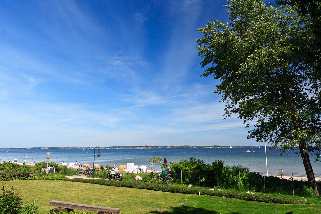 Bild 2/21: Drehen wir uns um 180 Grad eröffnet sich uns der Blick über die Wiese vor dem Haus auf die Flensburger Förde ...
